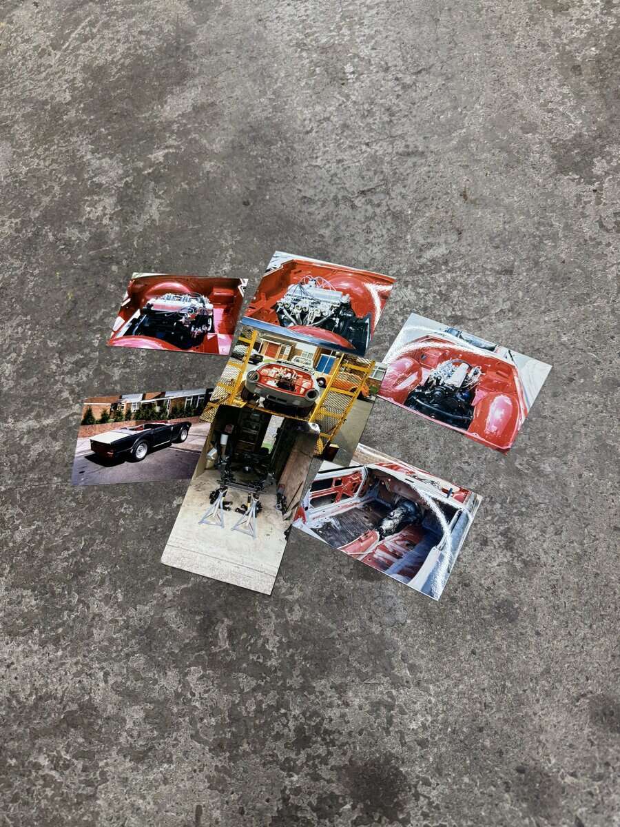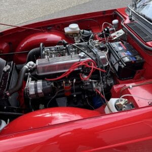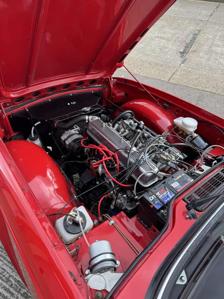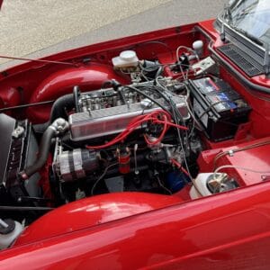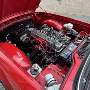 Inside, it features black leather seats with red piping, a matching red steering wheel and seat belts, a burr elm dashboard, and a black canvas hood — giving it a true classic sports-car feel.